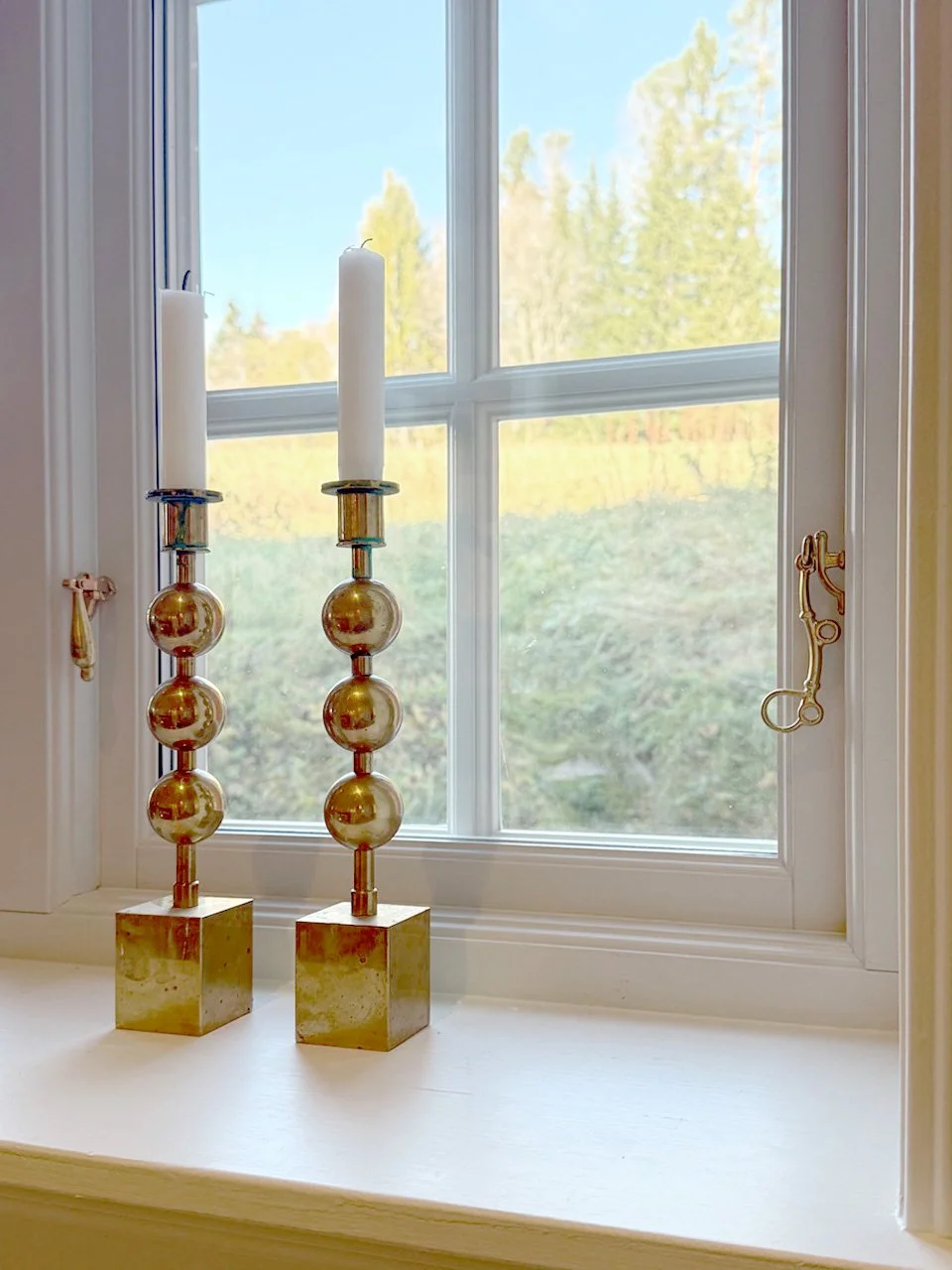 Det finns en detalj Cecilia återkommer till – Beslagen. Familjen valde beslag i polerad mässing. Inte för att det var trendigt, utan för att det hör hemma i ett hus från 1834.